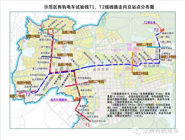 Modern tramcar T1 and T2 example line is total 34.7 kilometers and total investment 6.8 billion yuan .Example line adopt “BT+PPP” innovative investment and financing construction mode , this mode will cut down construction time and when running , it will relieve the government investment  pressure . T1 and T2 line will pass by valley walking street , guanshan road , third circle line ,WTA  international tennis center , valley central city , biolake , future science and technology city will also cover valley development core zone , southward along university road will reach to Tangxun lake station , along valley first road will reach to Fozuling liufang district .